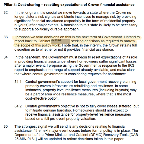 The accompanying Cabinet Paper shines a little more light on the issue of cost-sharing, which I discussed earlier in The Shift #1: Who pays, and who makes them pay, for climate adaptation. It expresses a preference for the Independent Reference Group (IRG) recommendation of a beneficiary-pays approach, with the Crown investing where it realises a benefit, or 'to help communities in highest risk areas but without the ability to pay.' However, it defers until next term any substantive decisions on long-run Crown financial assistance. In the nearer term, a forthcoming ministerial response to the IRG seeks to increase clarity – with a clear intent to be more discriminating and less magnanimous in Crown financial assistance. The relevant section is reproduced below.