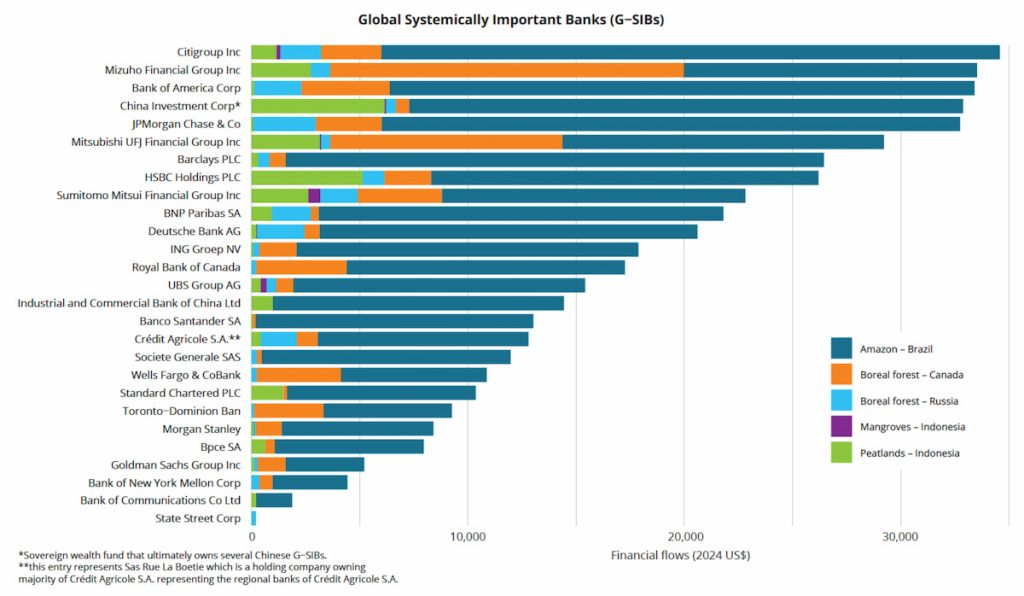 ... and exposure of globally systemic important banks (GSIBs) into the Amazon rainforest in Brazil; boreal forests in Canada and Russia; and mangroves and tropical peatlands in Indonesia.