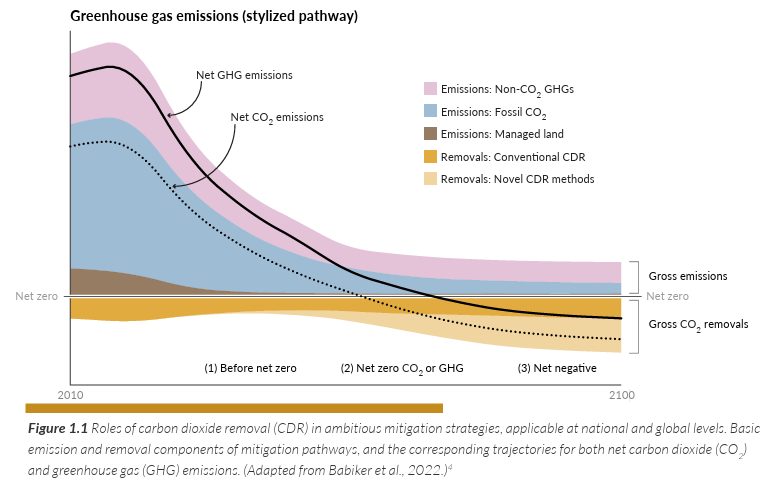 4.3. The fundamental step to addressing the issue of non-equivalence is to develop a coherent, comprehensive and credible removals strategy to 2050 and beyond. In its Sixth Assessment Report, the Intergovernmental Panel on Climate Change (IPCC) identified three roles for carbon dioxide removal (CDR): ‘(i) further reduce net CO2 or GHG emission levels in the near-term; (ii) counterbalance residual emissions from hard-to-transition sectors, such as CO2 from industrial activities and long-distance transport (e.g., aviation, shipping), or methane and nitrous oxide from agriculture, in order to help reach net zero CO2 or GHG emissions in the mid-term; (iii) achieve and sustain net-negative CO2 or GHG emissions in the long-term, by deploying CDR at levels exceeding annual residual gross CO2 or GHG emissions’ (Babiker et al. 2022; see also Smith et al. 2024). This is visualized in the chart below.