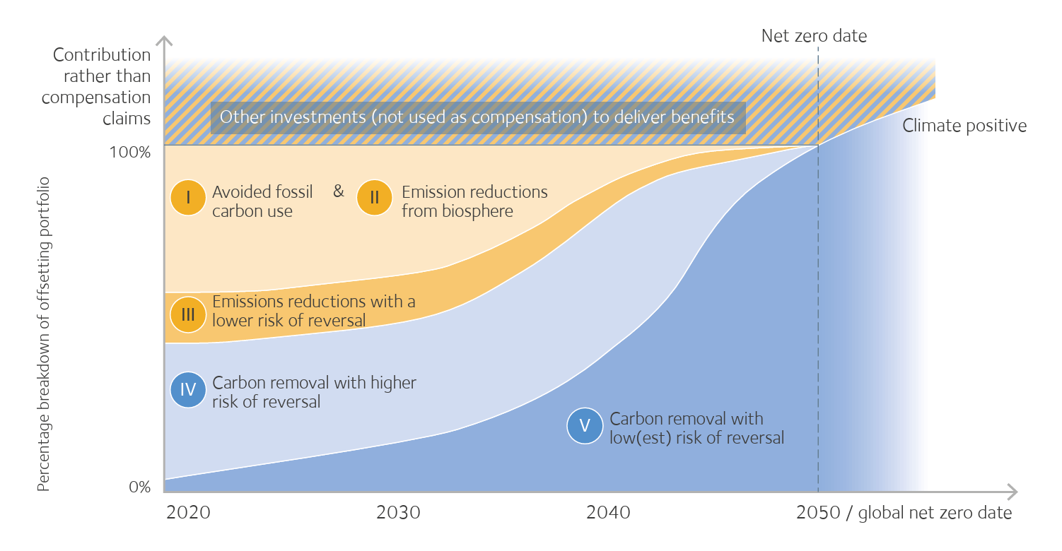 - 4.7.1. Implement a shift from (i) the use of biological removals for offsetting fossil emissions indiscriminately to (ii) the use of permanent removals with durable storage to compensate for residual emissions by the net zero target date. This like-for-like approach is consistent with the Oxford Offsetting Principles (Axelsson et al. 2024) and the concept of ‘geological net zero’ (Allen et al. 2025; Frame & Macey, 2025). This transition need not occur instantly, but should be complete once global net-zero is achieved (as shown by the figure below).
